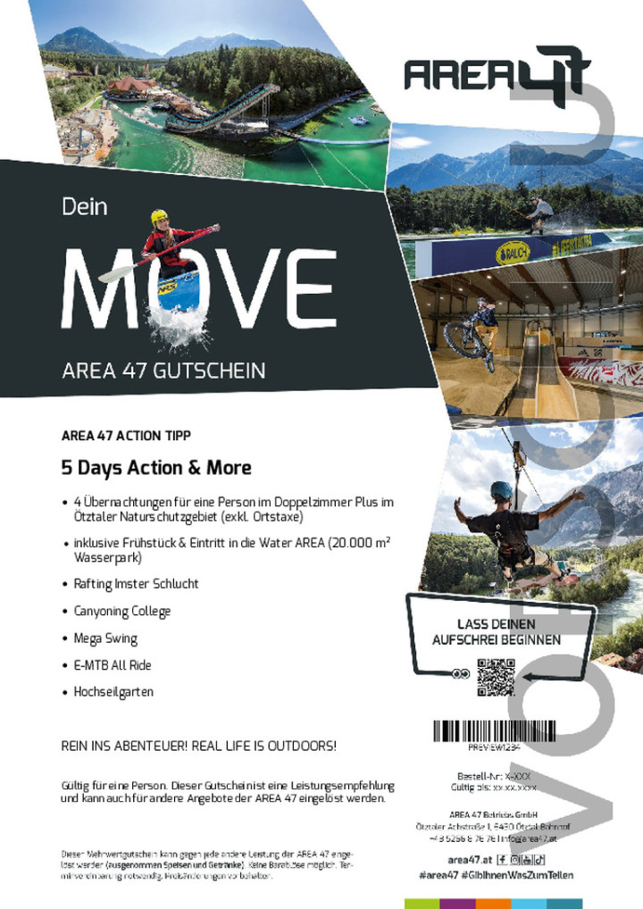 Voucher valid for one person. This voucher is a service recommendation and can also be redeemed for other AREA 47 offers.